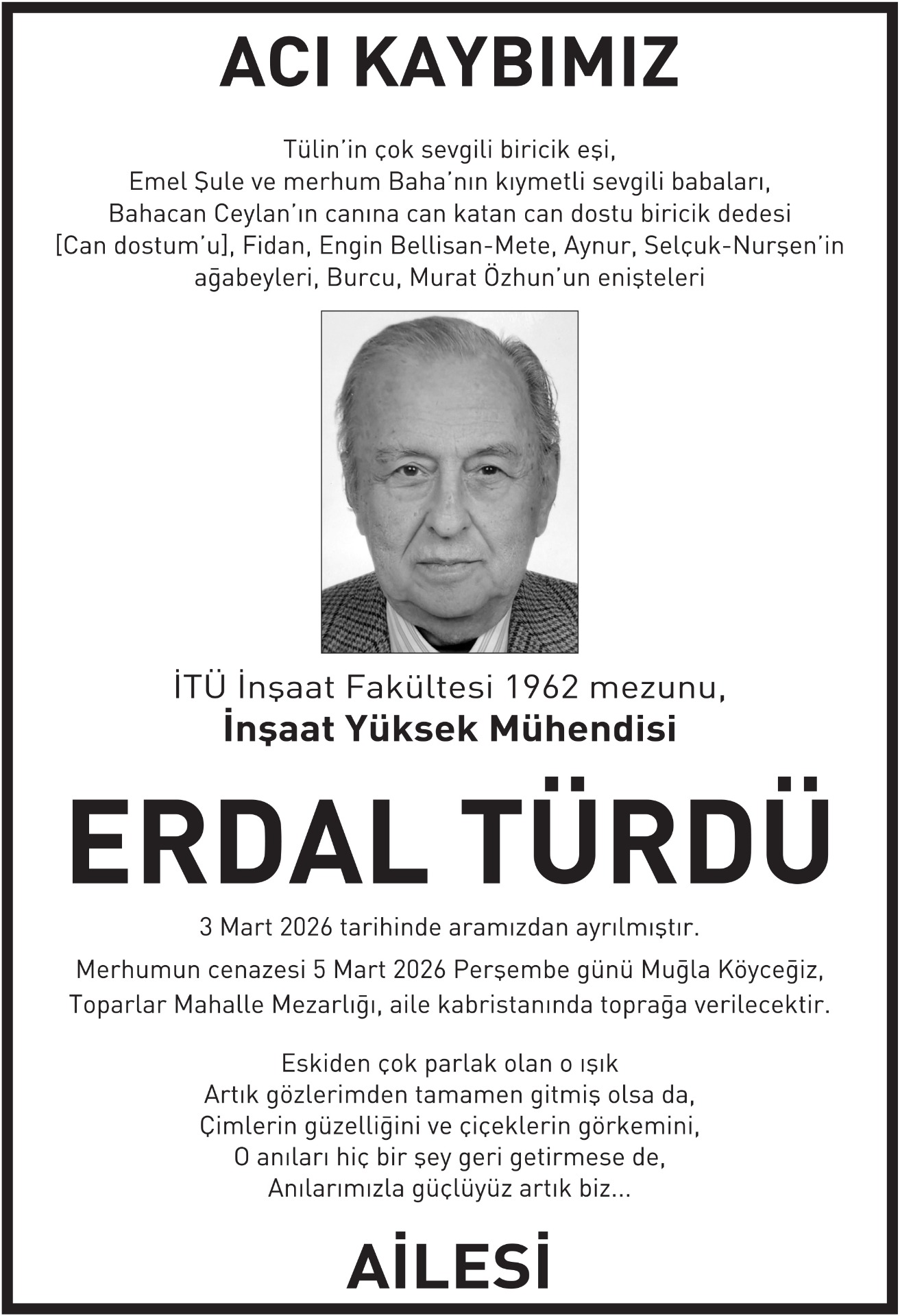 5 st x 25 cm Erdal Türdü vefat ilanı