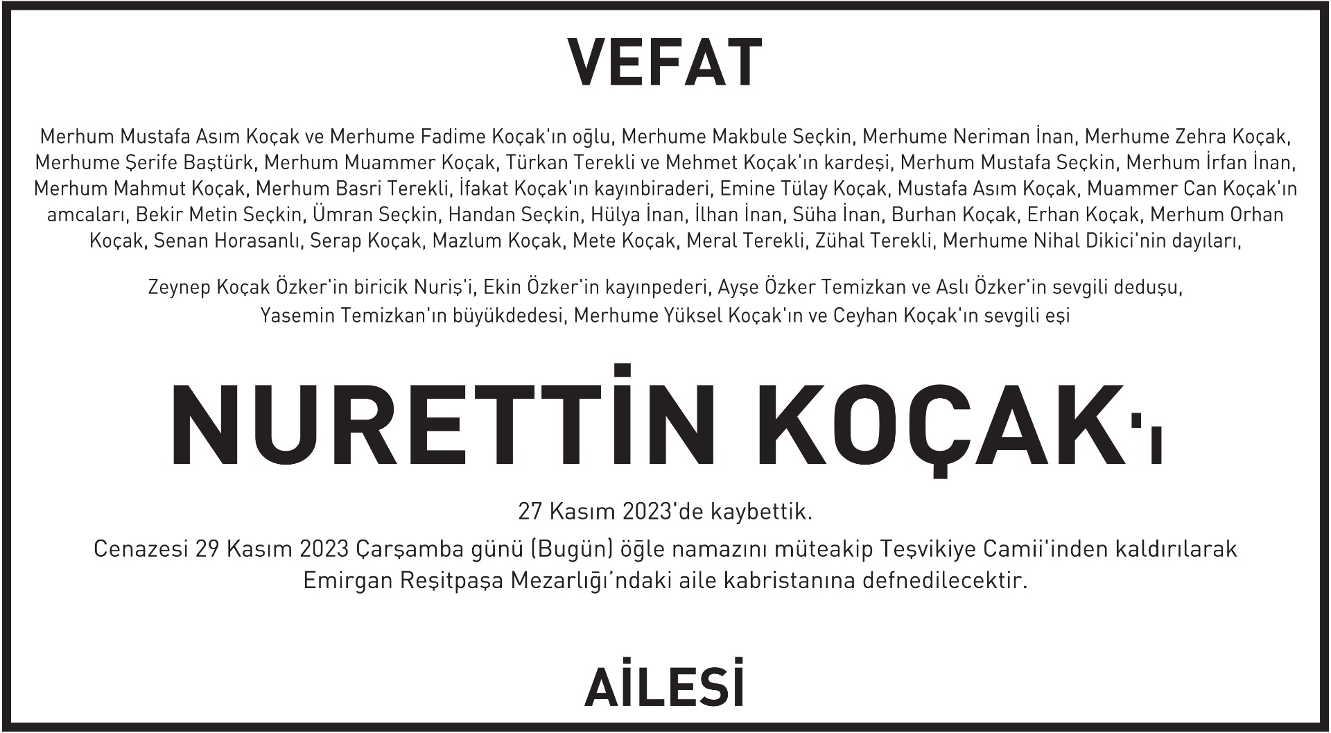 9 st x 20 cm Nurettin Koçak vefat ilanı