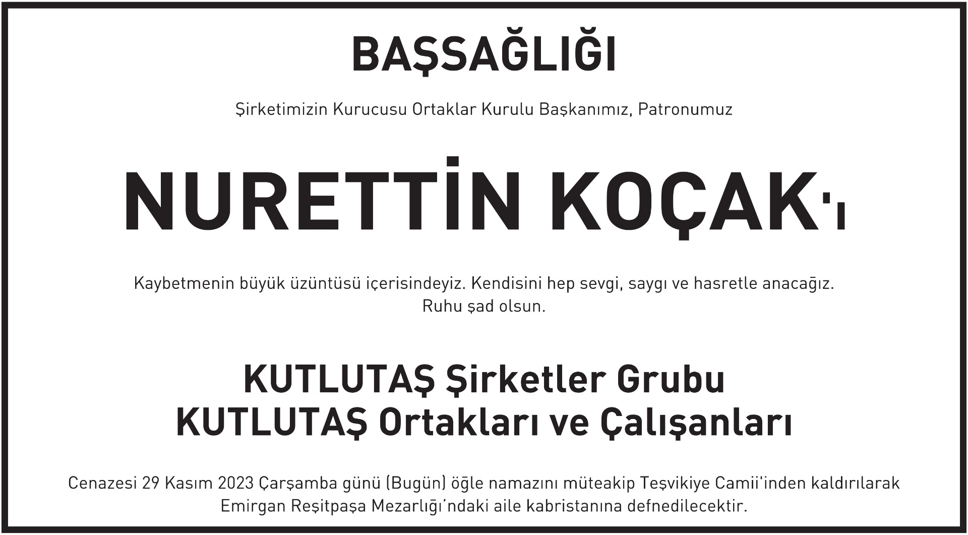 9 st x 20 cm Nurettin Koçak başsağlığı ilanı