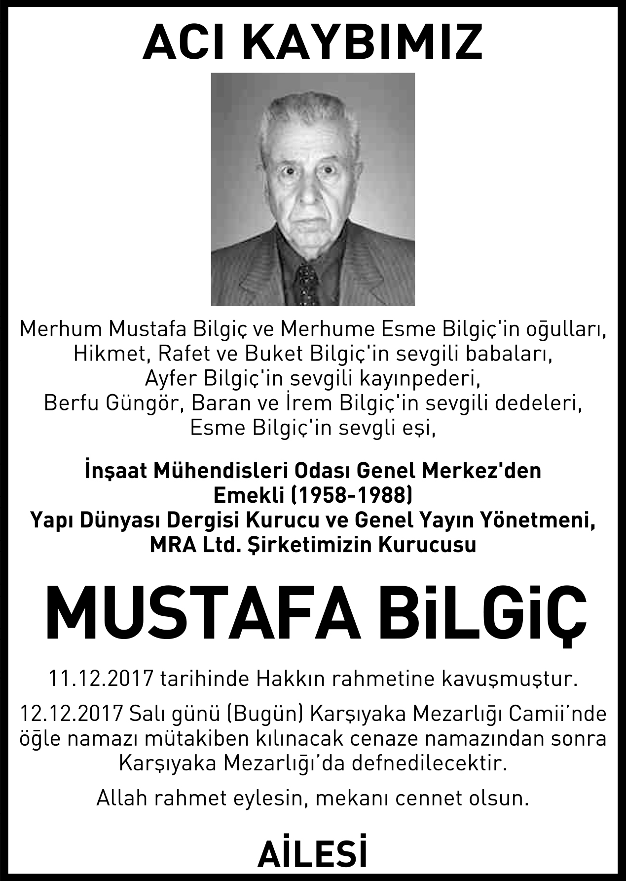3 st x 15 cm Mustafa Bilgiç vefat ilanı