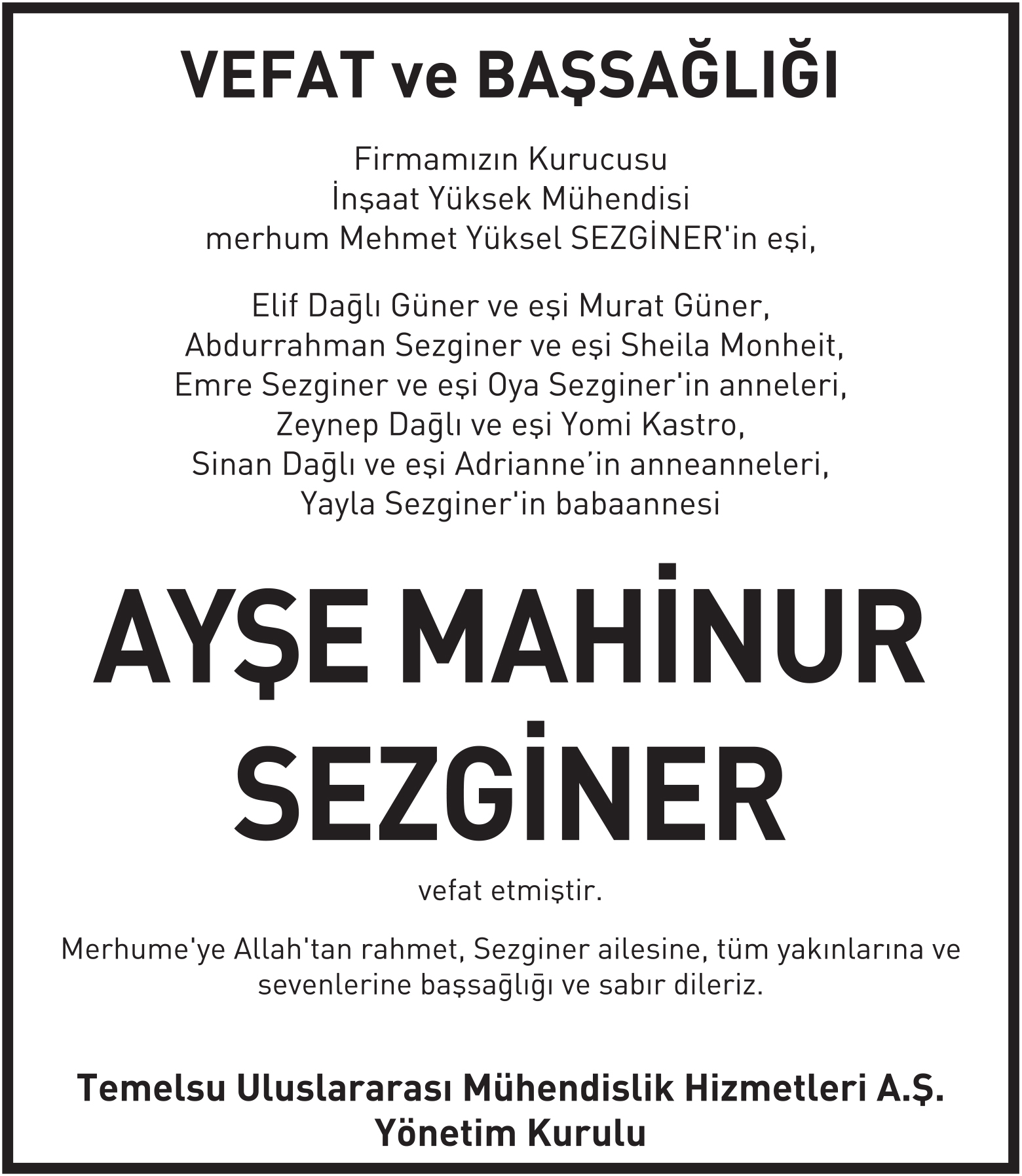 4 st x 15 cm Ayşe Mahinur Sezginer vefat ilanı