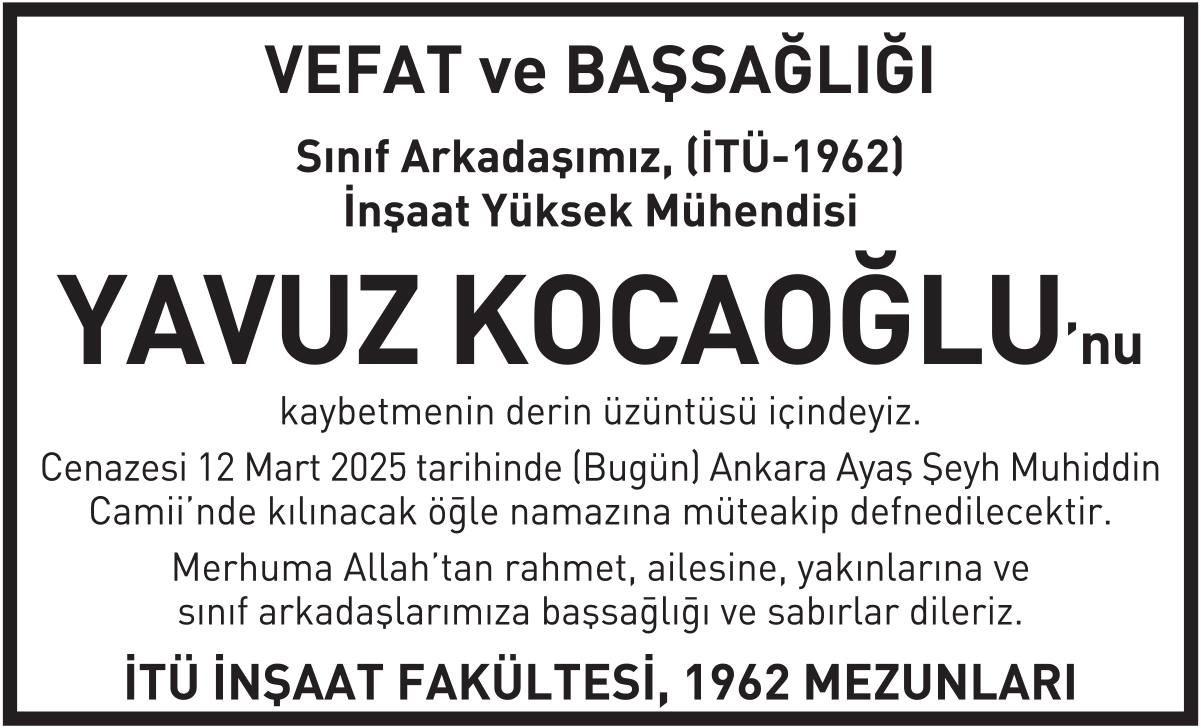 3 st x 6 cm Yavuz Kocaoğlu vefat ilanı